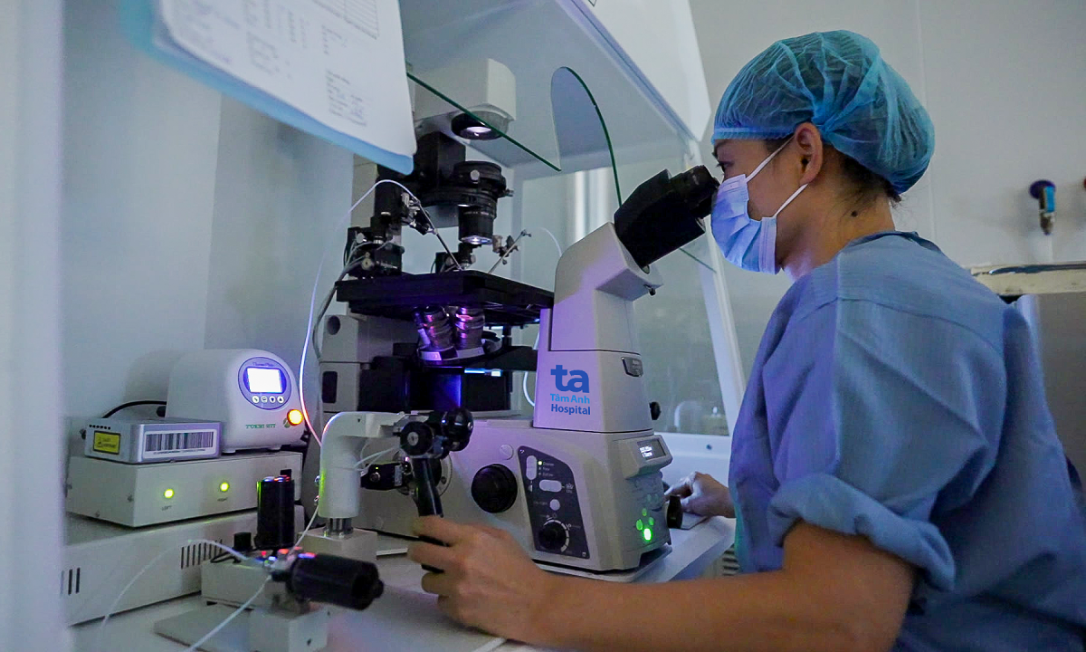 Bác sĩ Ngọc tư vấn vợ chồng chị Tâm thực hiện IVF kết hợp sàng lọc di truyền tiền làm tổ (PGT) để sinh con khỏe mạnh. Chị Tâm được chỉ định kích trứng theo phác đồ giảm số mũi tiêm so với thông thường, chọc hút thu 7 nang noãn. Bác sĩ chọn lọc những noãn trưởng thành mang thụ tinh với tinh trùng của người chồng bằng phương pháp tiêm vào bào tương noãn (ICSI) tạo phôi. Phôi thai tiếp tục được nuôi cấy và theo dõi trong tủ time-lapse tích hợp trí tuệ nhân tạo, thu được 3 phôi ngày 5.