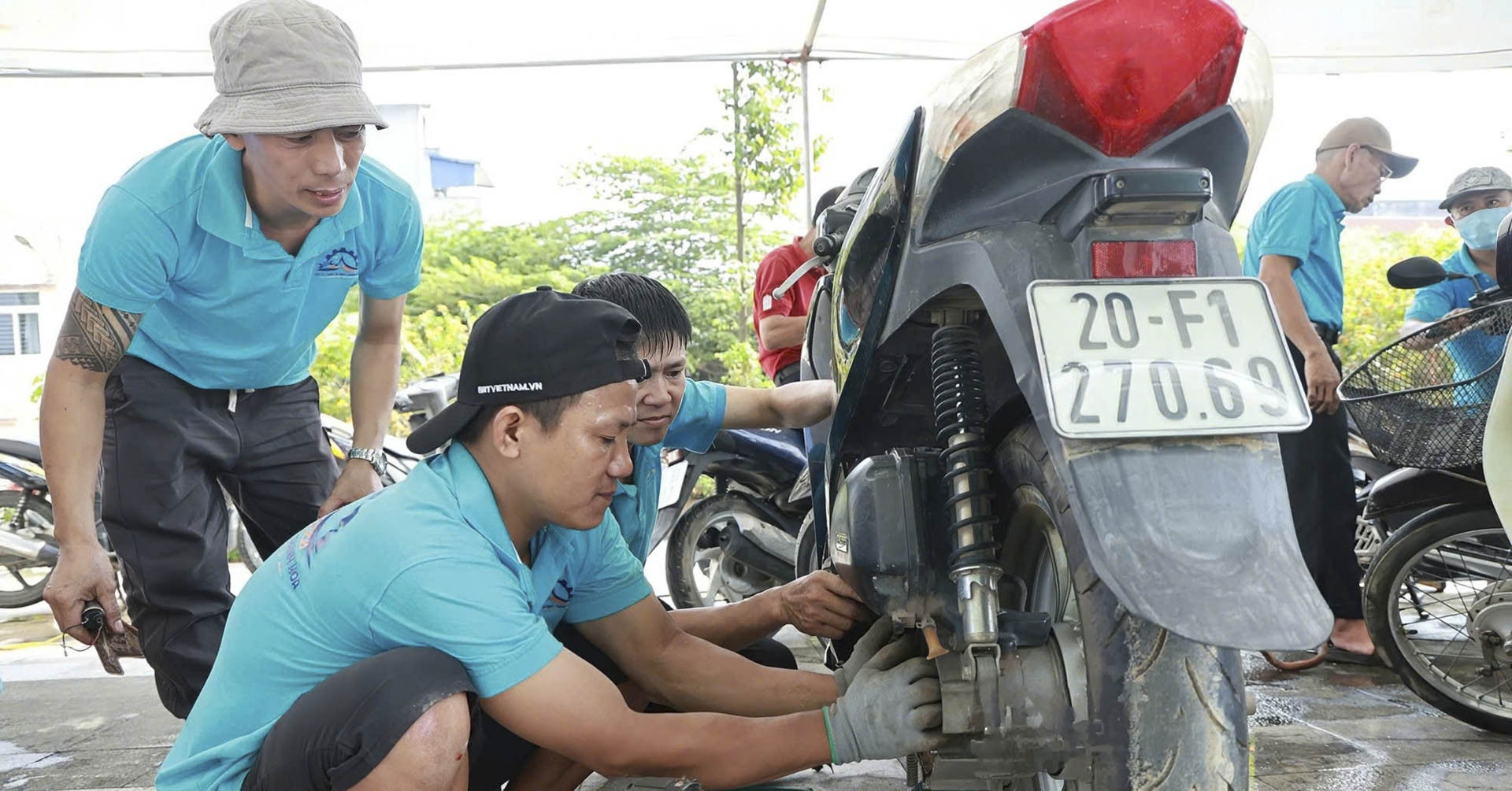 Trong hai ngày 13 và 14/10, tại tỉnh Thái Nguyên, hàng nghìn chiếc xe máy bị ảnh hưởng bởi bão số 11 đã được xếp hàng chờ sửa chữa. Hơn 120 kỹ thuật viên trong đồng phục xanh miệt mài kiểm tra, thay dầu, bảo dưỡng miễn phí cho người dân.