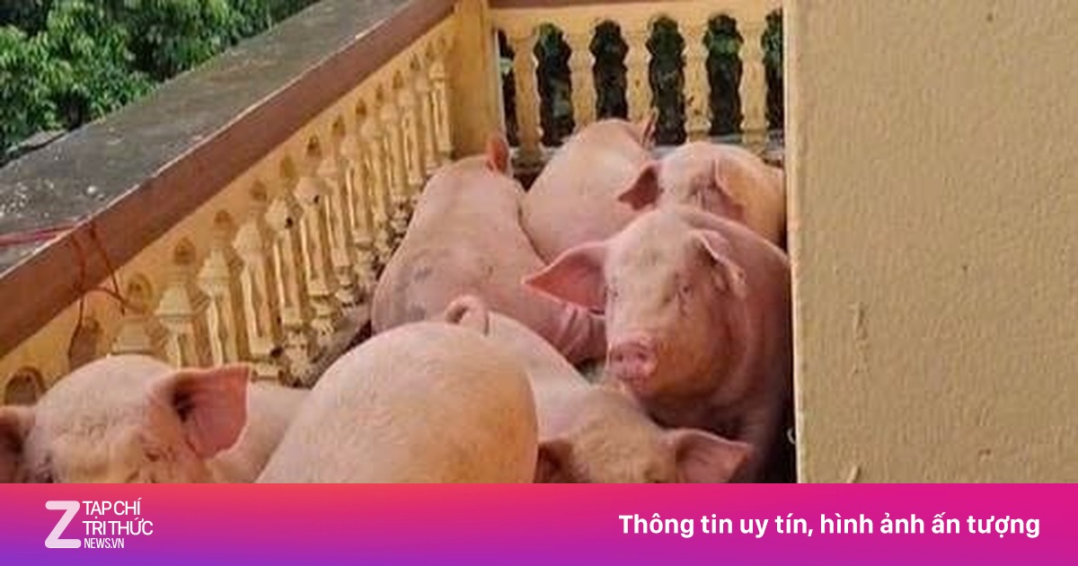 Video chị Oanh chia sẻ ghi lại cảnh những con lợn nằm chen chúc bên ngoài ban công nhỏ hẹp, phía đối diện là những con gà ướt sũng nước đứng tràn từ bên trong khu vực tầng 3 ra hết ban công. Chủ nhà đứng nhìn trong lo lắng và bất lực.