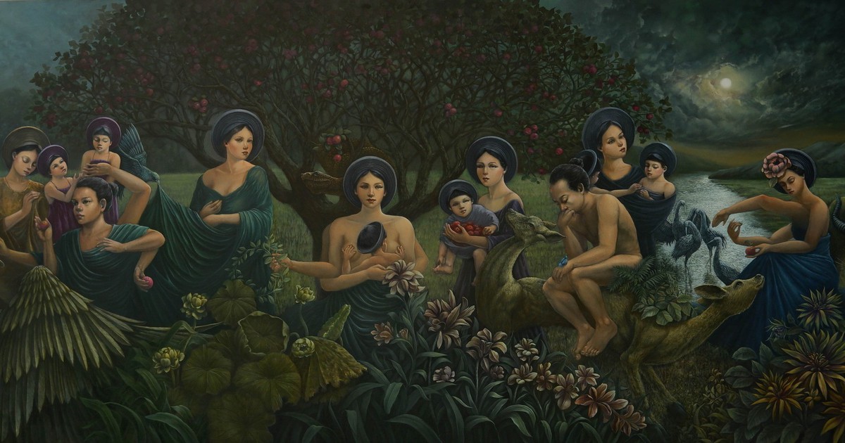Tranh của anh không tuân theo lý thuyết mà vận hành theo cảm xúc. Từ những bản phác thảo chì chi tiết, anh vẽ từng lớp, từng màu như đang chăm chút một khu vườn: khu vườn siêu thực, đầy ánh sáng và sự sống. Đất mẹ vì thế là kết tinh cho hành trình sáng tạo lặng lẽ nhưng đầy nội lực ấy.