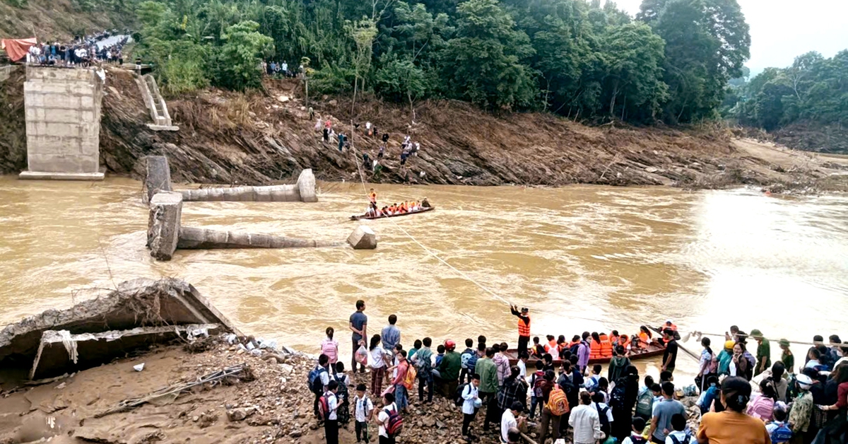 Bão Bualoi gây ra đợt lũ ống, lũ quét cuốn trôi cầu cứng ở một xã miền núi phía tây tỉnh Nghệ An. Chính quyền địa phương phải dùng thuyền đưa các em vượt lũ tới trường.