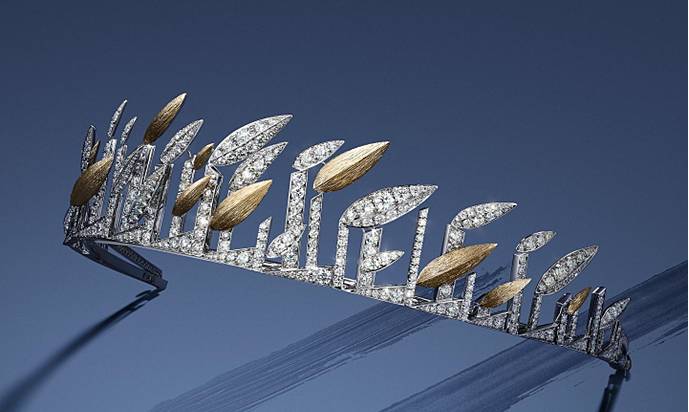 Chiếc vương miện được điểm xuyết bằng bốn viên kim cương brilliant-cut (khoảng 0,42 carat mỗi viên) cùng hàng pavé kim cương nhỏ, vừa tạo điểm nhấn lấp lánh, vừa giữ được sự tinh giản, thanh thoát. Thiết kế này mang đậm tinh thần trừu tượng và kiến trúc hiện đại, gợi lại dấu ấn Art Deco nhưng vẫn giữ nét nữ tính đặc trưng của Chaumet. Theo hãng, vương miện Bamboo không chỉ là tác phẩm nghệ thuật chế tác đỉnh cao, mà còn là lời tôn vinh vẻ đẹp của thiên nhiên và di sản sáng tạo bền vững mà Chaumet luôn theo đuổi.