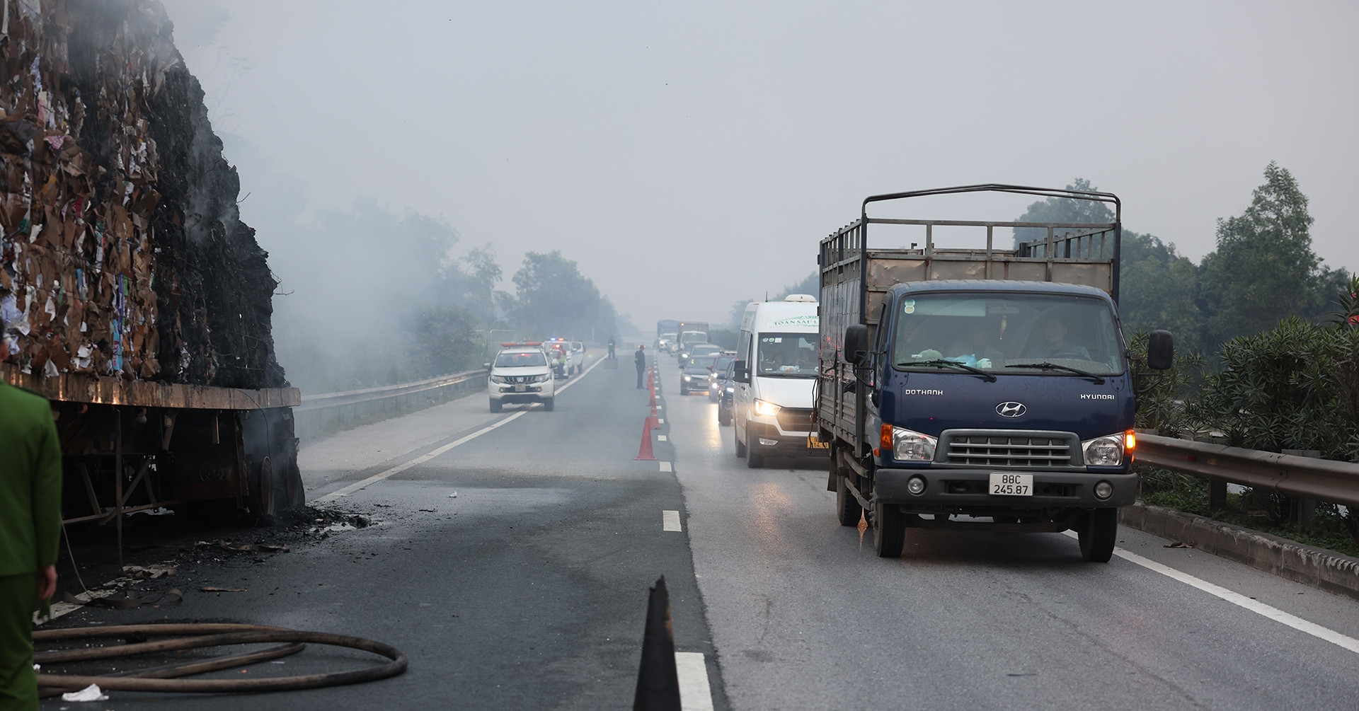 Một xe sơ mi rơ-moóc chở phế liệu bốc cháy khi di chuyển trên cao tốc Nội Bài - Lào Cai, đoạn qua tỉnh Phú Thọ, giao thông qua khu vực chậm nhưng không bị chia cắt kéo dài.