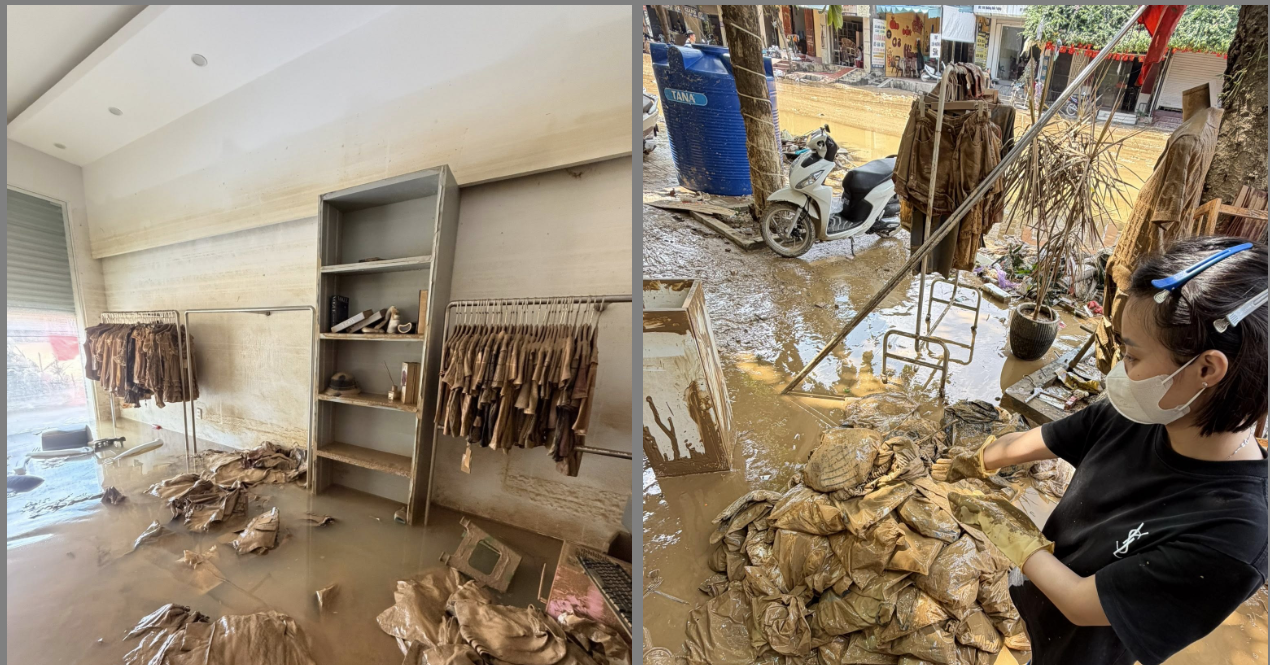 Từ bức ảnh được chị Trang chia sẻ, có thể thấy rõ mức độ tàn phá khủng khiếp của trận lũ. Quần áo, túi xách và giày dép dính đầy bùn đất, ngổn ngang trên nền nhà. Các giá treo, kệ gỗ và thiết bị trang trí đều bị ngấm nước, cong vênh, hư hại. Dấu vết nước ngập vẫn còn in đậm trên tường, cao đến gần vai người lớn, minh chứng cho mực nước dâng cao bất thường.