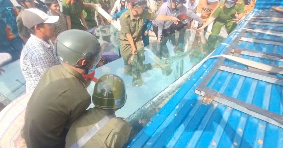 Ngay khi phát hiện sự việc, Công an xã Bình Đức, các lực lượng chức năng cùng người dân đã lập tức chạy tới, hợp sức để nâng và đẩy khối kính lên rồi kéo hai công nhân thoát ra.