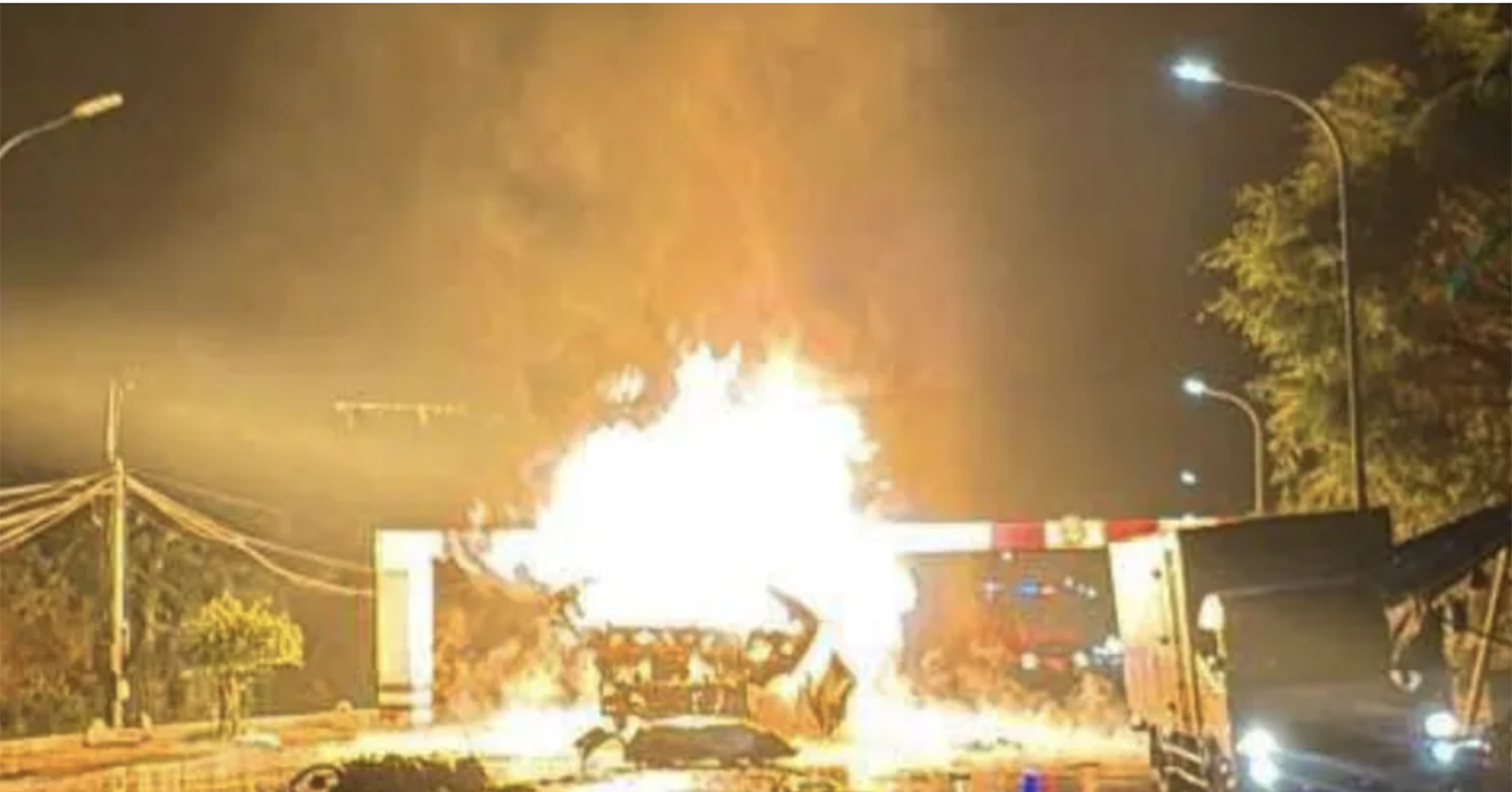 Trong lúc lưu thông, xe bồn chở gas mắc kẹt vào barie tại khu công nghiệp rồi phát nổ. Tiếng nổ lớn có thể nghe thấy từ rất xa, sau đó ngọn lửa bốc lên dữ dội.