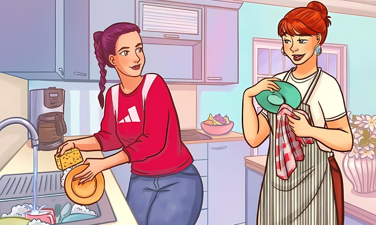 Hai người phụ nữ đang rửa bát cùng nhau trong một căn bếp hiện đại. Một người mặc áo nỉ đỏ đang rửa bát và một người mặc tạp dề sọc đang lau khô bát đĩa. Nhưng có một điều bất ngờ là một trong hai người dùng đồ giả.