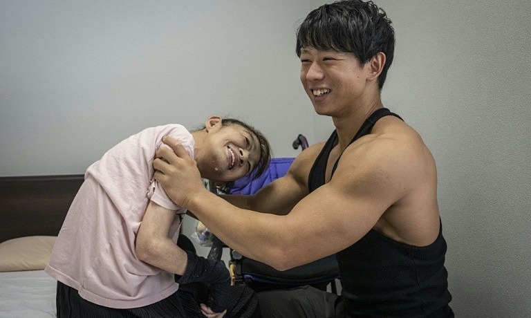 Mặc áo ba lỗ màu đen khoe làn da rám nắng cùng đôi tay cơ bắp cuồn cuộn, Takuya Usui nhẹ nhàng bế bà Madoka Yamaguchi, 65 tuổi, lên xe lăn trong viện dưỡng lão dành cho người khuyết tật của công ty Visionary ở gần thành phố Nagoya.