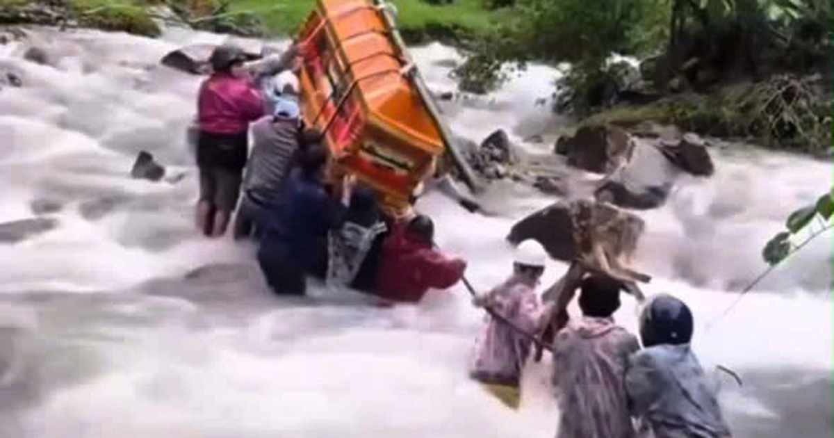 Con suối với dòng nước lũ đục ngầu, chảy xiết và sâu đến ngang bụng khiến mỗi bước đi của họ trở nên vô cùng nguy hiểm và vất vả. Nhóm người trong clip phải dùng gậy để dò đường và giữ thăng bằng.