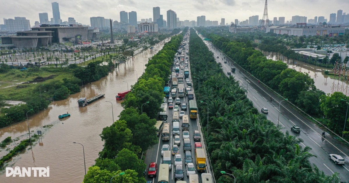 (Dân trí) - Do một đoạn trên Đại lộ Thăng Long ngập sâu sau cơn mưa lớn ngày 30/9, giao thông khu vực này gần như têt liệt, giao thông ùn tắc kéo dài gần 10km.