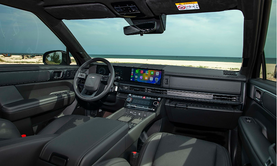 Trong phân khúc SUV cỡ D, Hyundai tạo ra Santa Fe với kỳ vọng "có tất cả mọi thứ", thể hiện ở những trang bị trong không gian nội thất. Mẫu xe thế hệ mới được hãng Hàn Quốc trang bị cần số tích hợp vô-lăng, giúp mở rộng diện tích nội thất so với kiểu bố trí truyền thống. Màn hình giải trí dạng cong 12,3 inch, cửa sổ trời kép là những trang bị có ở bản cao cấp.