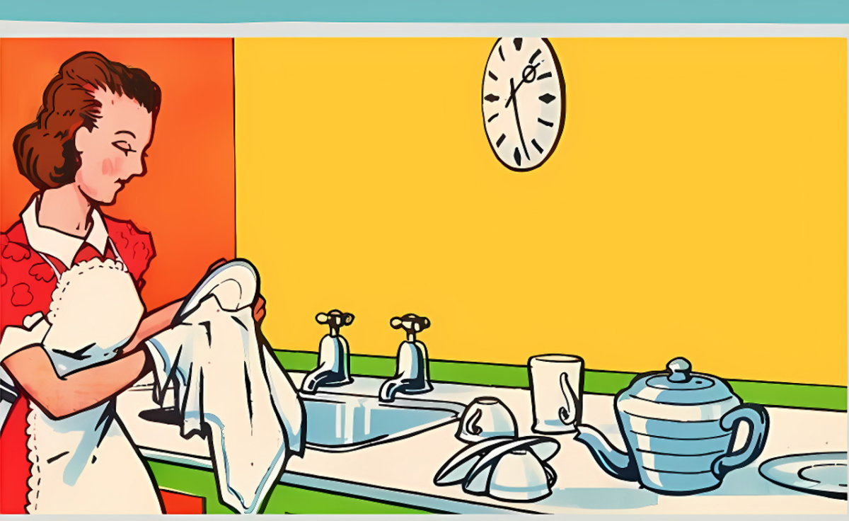 Trong bức ảnh miêu tả một người phụ nữ đang làm việc nhà trong bếp, với bồn rửa chén, vòi nước, cốc chén, ấm trà và một chiếc đồng hồ treo tường, có một lỗi duy nhất mà bạn cần phải tìm ra.