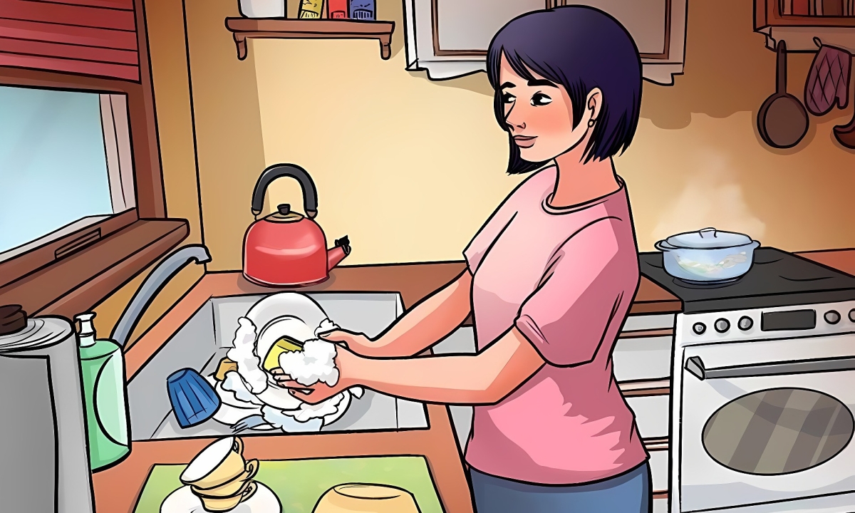 Đây là cảnh một khoảnh khắc yên bình trong bếp. Một người phụ nữ đang rửa bát trong khi có thứ gì đó sủi bọt trên bếp và một ấm đun nước màu đỏ nằm cạnh bồn rửa... mọi thứ trông đều ổn? Hãy nhìn kỹ bức ảnh này và ở đâu đó, có điều gì đó sai.
