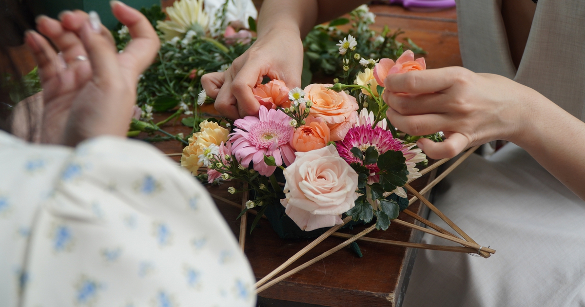 Xung quanh vài nhóm bạn trẻ cũng chăm chú cắm hoa, trao đổi cách phối màu để lồng đèn thêm rực rỡ. Oanh cho biết cô biết đến hoạt động làm lồng đèn hoa tươi qua mạng xã hội và nhanh chóng tìm đến trải nghiệm.