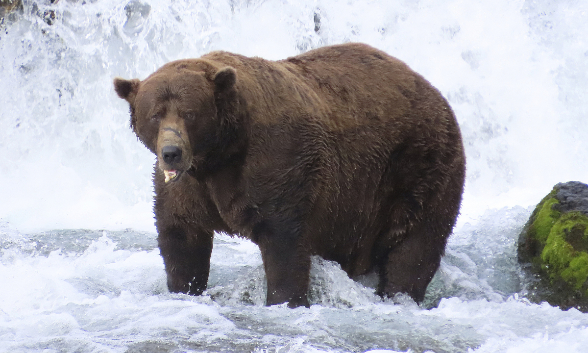 32 Chunk, nặng khoảng 580 kg, được mô tả là "con gấu nâu mạnh nhất trên sông", nổi bật với đôi mắt cụp, lông nâu sẫm và vết sẹo dài trên mõm. Con gấu chiến thắng dù bị gãy hàm, nghi do đánh nhau với một con đực khác để giành gấu cái.
