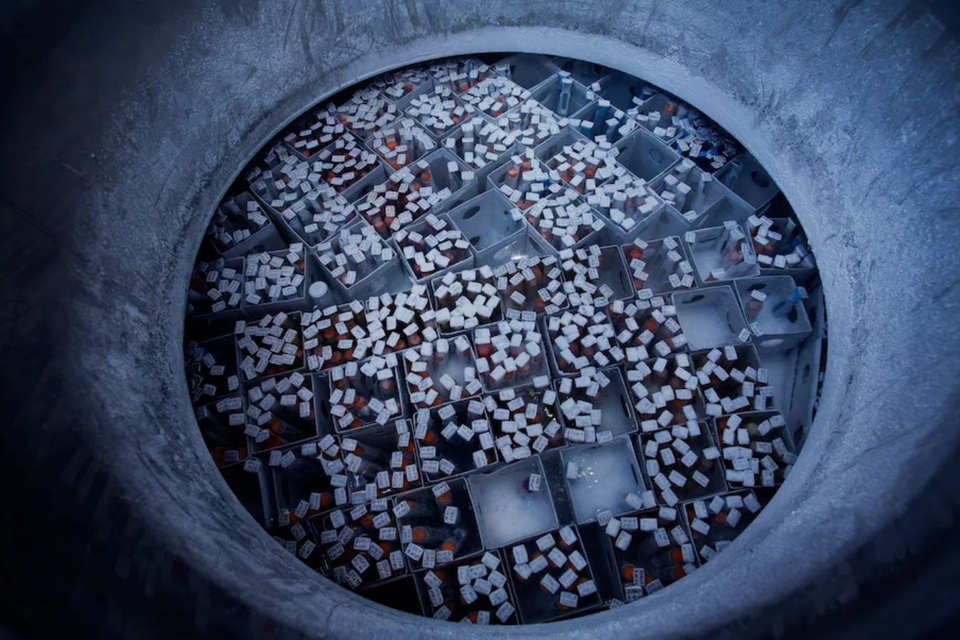 Các lọ tinh trùng đông lạnh của người hiến bên trong bể chứa nitơ lỏng tại California Cryobank, một trong những ngân hàng tinh trùng lớn nhất thế giới. Ảnh: Ted Soqui. |