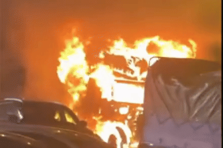 Phát hiện sự việc, tài xế nhanh chóng dừng xe và thoát ra ngoài. Ngọn lửa sau đó bùng lên dữ dội kèm theo một số tiếng nổ; khói bốc mù mịt.