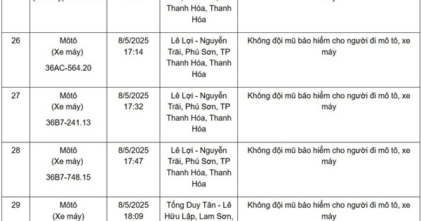 Vào ngày 29/5 vừa qua, Phòng Cảnh sát giao thông, Công an tỉnh Thanh Hóa thông báo về các phương tiện vi phạm TTATGT đường bộ. 36 phương tiện này được phát hiện qua Hệ thống camera giám sát an ninh trật tự và an toàn giao thông trên địa bàn từ ngày 06/5/2025 đến ngày 10/5/2025, cụ thể như sau: