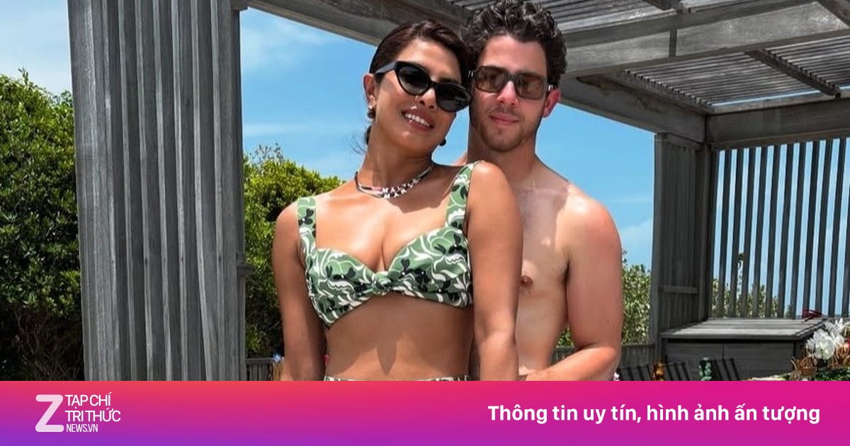 Chopra Jonas diện bộ bikini 2 mảnh kín đáo nhưng vẫn khoe được vóc dáng quyến rũ. Trong khi đó, con gái 3 tuổi đeo một vòng hoa và băng đô in hình cây cọ. Cặp sao đăng ảnh nhóc tỳ song vẫn khéo léo giấu mặt cô bé.