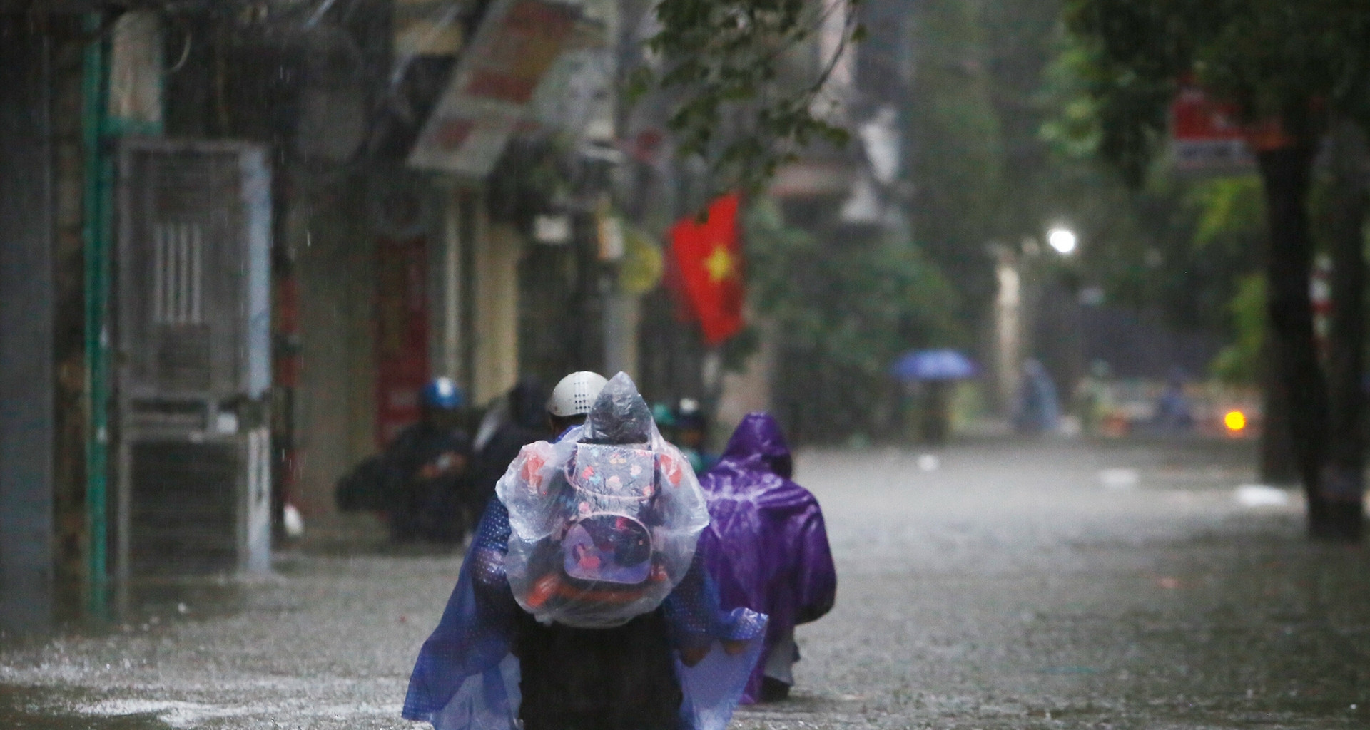 Ban đầu, tôi chủ quan, dắt xe máy ra đường. Đi được một đoạn, nước đã ngập quá đầu gối khiến xe chết máy. Tôi đành dắt xe về nhà trong cơn mưa tầm tã, rồi đi bộ ra đón con.