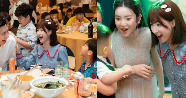 Không chỉ ăn mặc trẻ trung, nữ ca sĩ còn “chiếm spotlight” nhờ năng lượng vui nhộn, hòa đồng suốt buổi tiệc. Cô lên sân khấu hát tặng bé Lido một ca khúc thiếu nhi, vừa nhún nhảy múa tay tương tác cùng các bé, khiến không khí thêm sôi động. Thậm chí Hòa Minzy còn trêu đùa gọi bé Lido là “bác”, khiến nhiều người bật cười vì sự duyên dáng, tự nhiên. Khoảnh khắc Hòa Minzy chung khung hình với Chu Thanh Huyền cũng gây chú ý, dù hơn vợ Quang Hải tới 5 tuổi nhưng Hòa Minzy vẫn trẻ trung, không lép về so với nàng WAG.