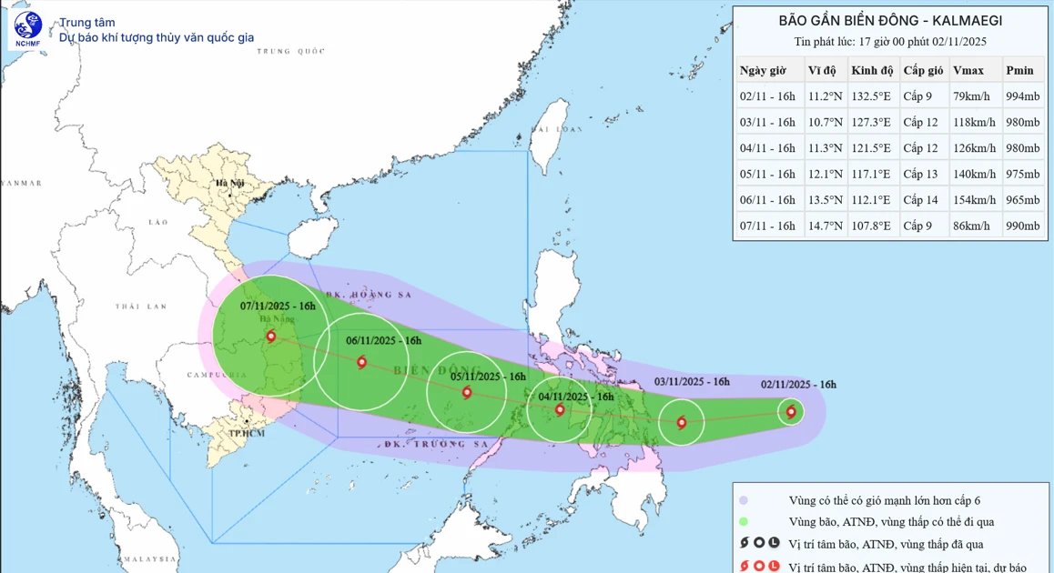TPO - Những nhận định của Việt Nam và quốc tế có sự thống nhất cao khi cho rằng, bão Kalmaegi khi vào Biển Đông (bão số 13) có thể rất mạnh, đạt cấp 13-14, giật cấp 16-17, hướng thẳng về vùng biển Nam Trung Bộ nước ta.