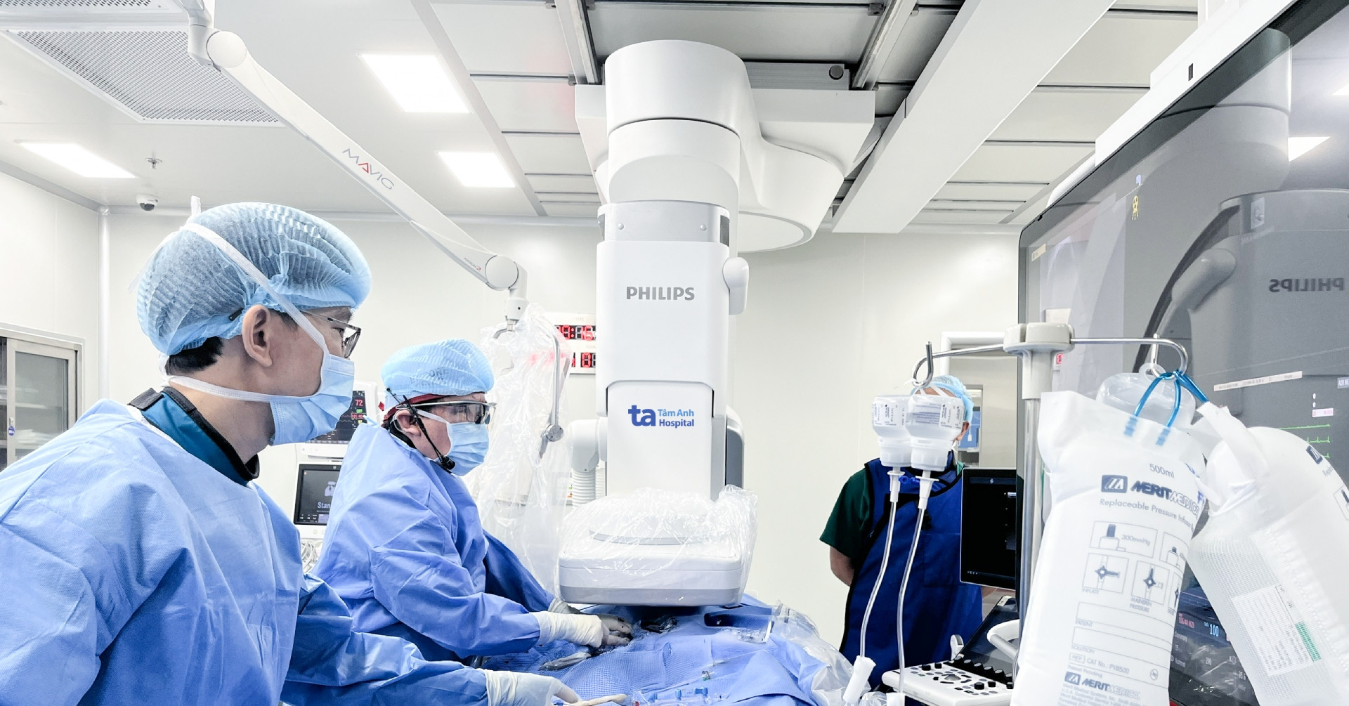 Bệnh viện trang bị phòng can thiệp Hybrid,Cath Lab hiện đại với bàn mổ chuyên dụng, hệ thống chụp mạch số hóa xóa nền (DSA) cánh tay robot xoay 360 độ, chụp cắt lớp kết quang nội mạch (OCT), siêu âm tim qua thực quản, hồi sức với Bóng dội ngược động mạch chủ (IABP), hệ thống ôxy hóa qua màng ngoài cơ thể (ECMO), hệ thống monitor theo dõi bệnh nhân hiện đại, camera 3D/4D, màn hình lớn, hệ thống hình ảnh tích hợp cho phép quan sát rõ cấu trúc tim, mạch máu, van tim, trong lúc thực hiện thủ thuật… góp phần tối ưu hiệu quả, an toàn trong điều trị.