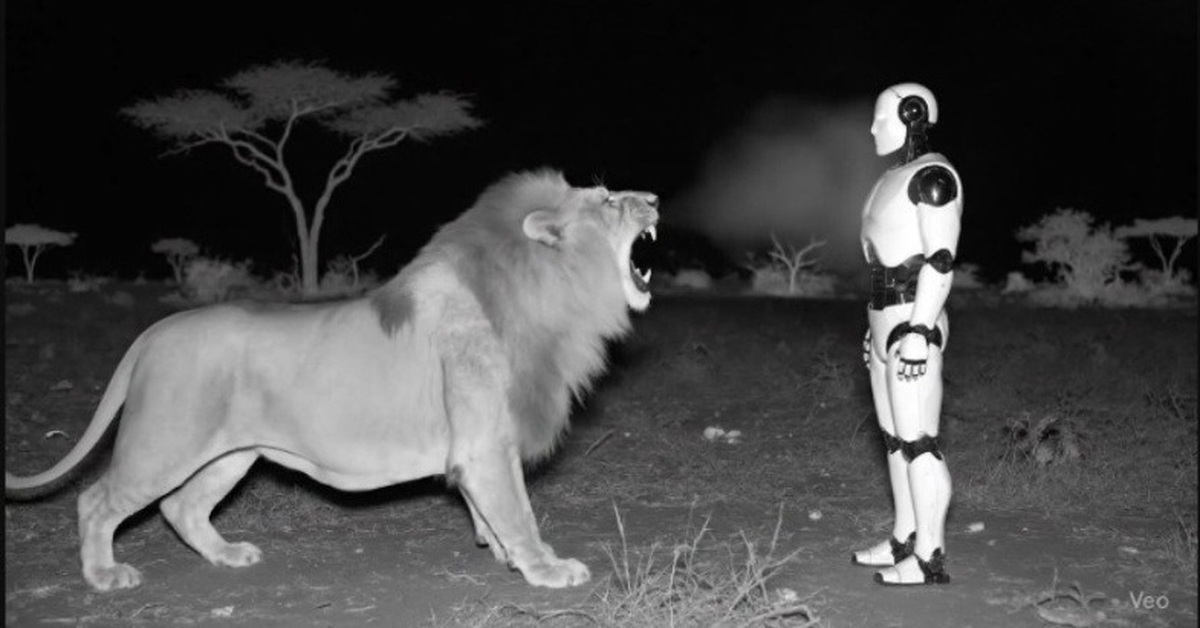 Bởi vì con sư tử, robot AI trong video và những hình ảnh nói trên đều là sản phẩm của VEO3, do đó việc một robot AI sợ sệt trước một con sư tử là câu chuyện hoàn toàn hư cấu.