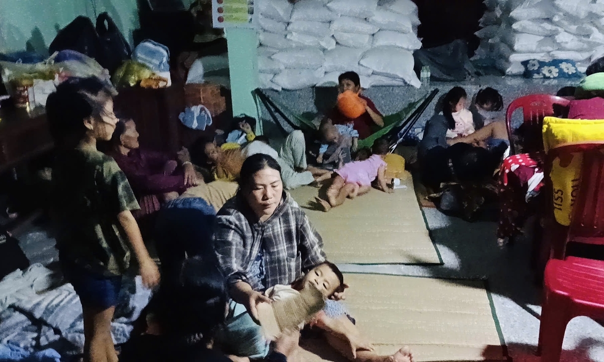 Mọi người co cụm vào một góc, cách xa cửa sổ. Nỗi lo lớn nhất là khu vệ sinh nằm tách biệt ngoài sân, không ai dám ra. Nhiều gia đình chủ động mang bô cho trẻ nhỏ. "Cũng may đã sơ tán kịp thời, chứ cố thủ ở nhà cấp bốn lúc này không biết chuyện gì sẽ xảy ra", chị Liên nói.