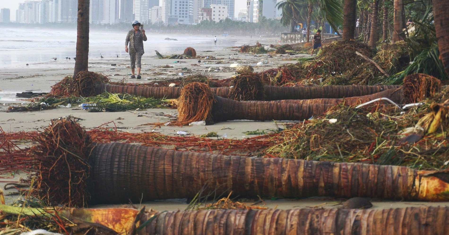 Sau khi bão số 13 Kalmaegi quét qua, hàng loạt cây dừa ven biển Đà Nẵng bị gió lớn và sóng mạnh đánh ngã rạp, rác tràn lên tuyến đường du lịch.