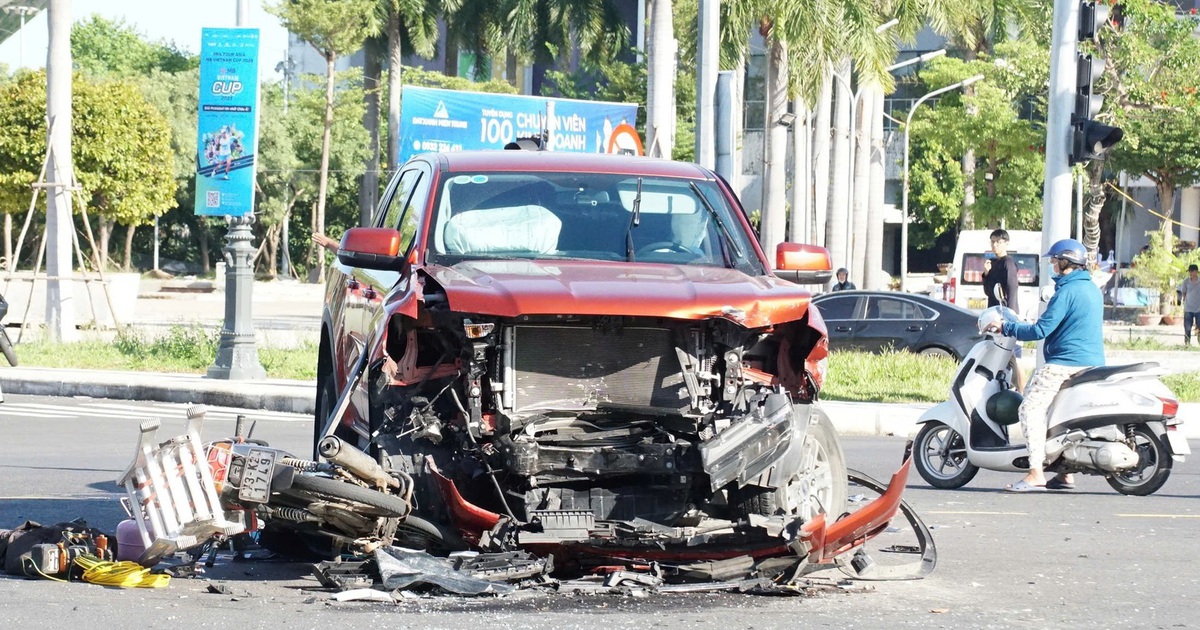 Theo ghi nhận tại hiện trường, khoảng 13 giờ 30 ngày 1.10, tại ngã tư 2 Tháng 9 - Phan Đăng Lưu, chiếc xe bán tải phần đầu bị bể toác, phía trước đầu xe bán tải là chiếc xe máy bị biến dạng. Còn chiếc xe 7 chỗ cũng bị hư hỏng nặng sau khi va vào đuôi xe bán tải nói trên.