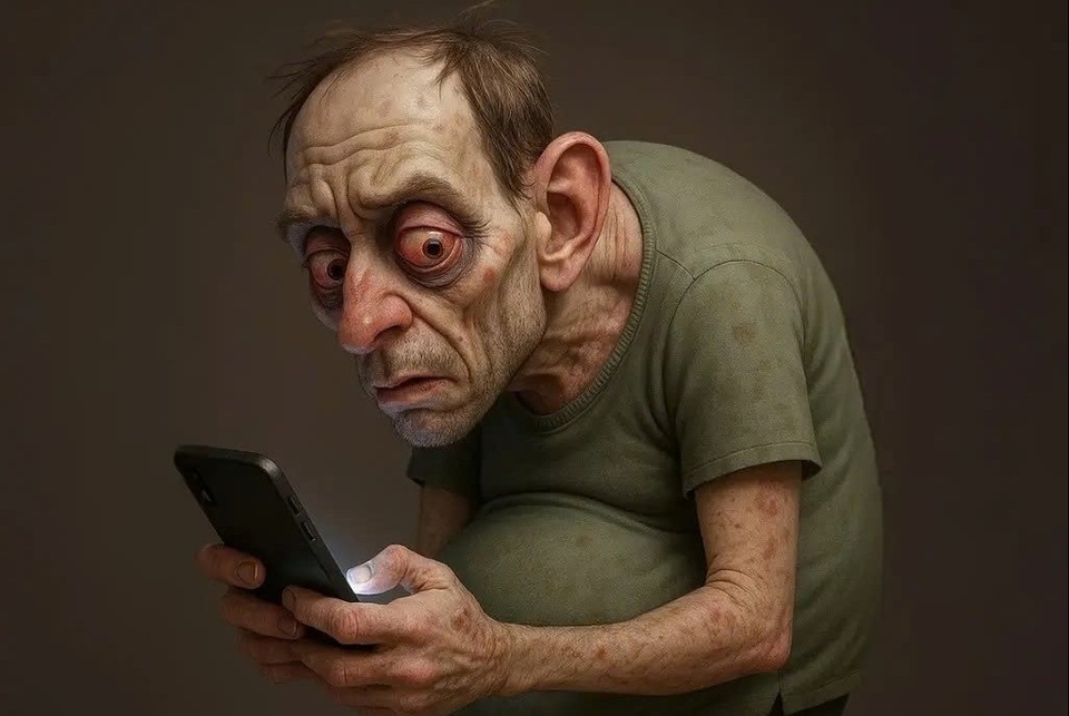 | AI mô tả hình ảnh con người vào năm 2050 nếu tiếp tục lối sống ít vận động, dùng điện thoại quá nhiều. |
