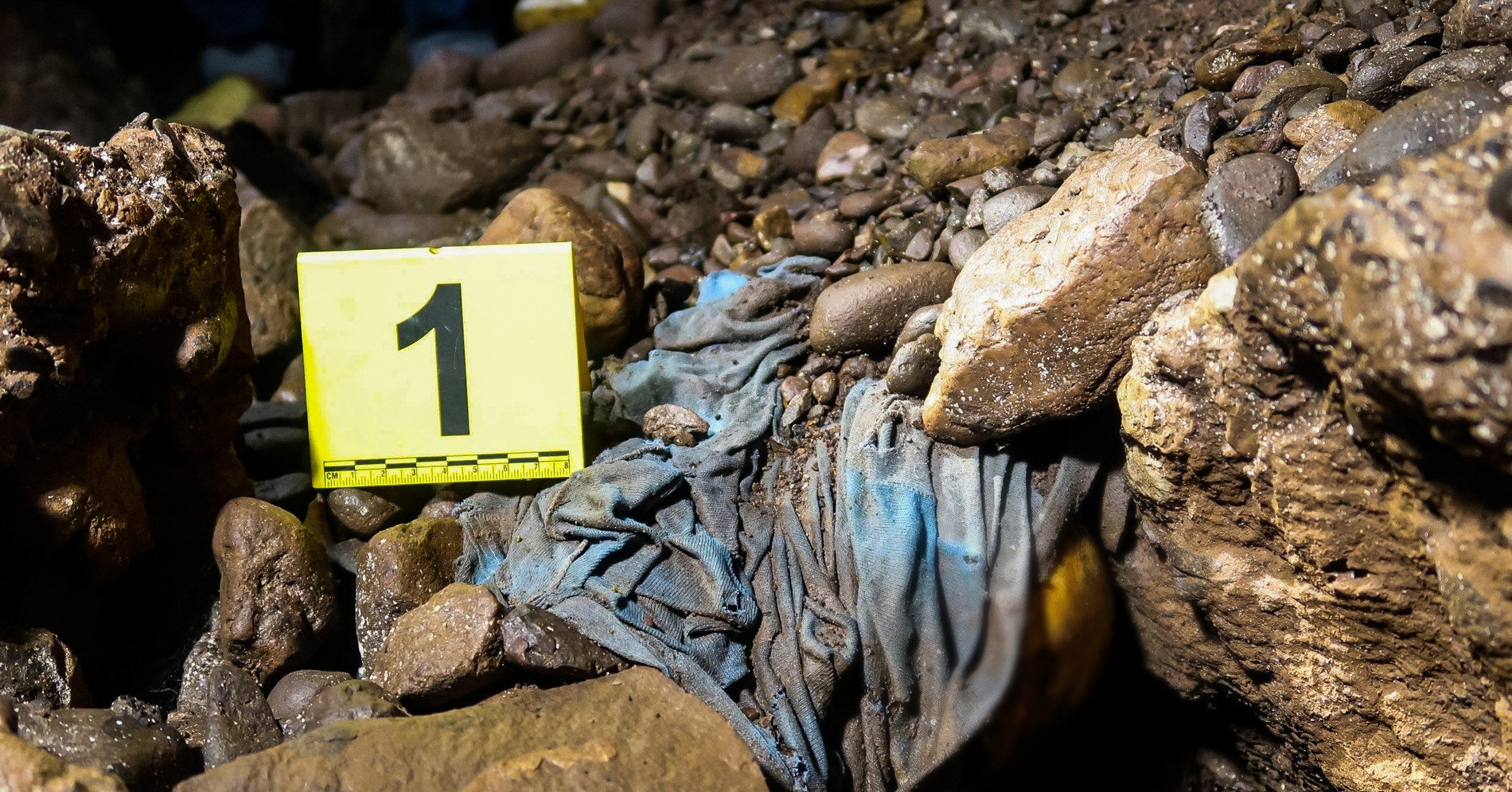 Cảnh tượng đầu tiên đập vào mắt các trinh sát hình sự là một chiếc áo phông cộc tay màu xanh, đã rách bươm theo năm tháng. Bên dưới lớp áo và nền đất đá, những đoạn xương lộ ra, một khung cảnh tĩnh lặng đến lạnh người.