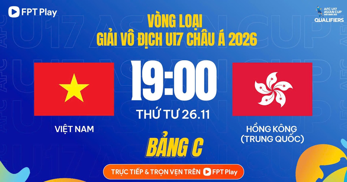 Hôm nay 26.11, bảng C vòng loại giải U.17 châu Á 2026 tiếp diễn với các trận đấu thuộc lượt trận thứ ba. Đáng chú ý, U.17 Việt Nam với tư cách là chủ nhà, chạm trán với đội tuyển U.17 Hồng Kông trên sân vận động PVF - Hưng Yên vào lúc 19 giờ.