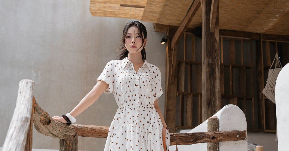 Đầm sơ mi trắng với họa tiết chấm bi nhỏ xinh gợi vẻ đẹp vừa cổ điển vừa lãng mạn. Dáng suông dài với eo bo chun tinh tế, tôn vòng eo thon, thêm đôi xăng đan quai mảnh và túi cói tôn vẻ mong manh của người mặc.