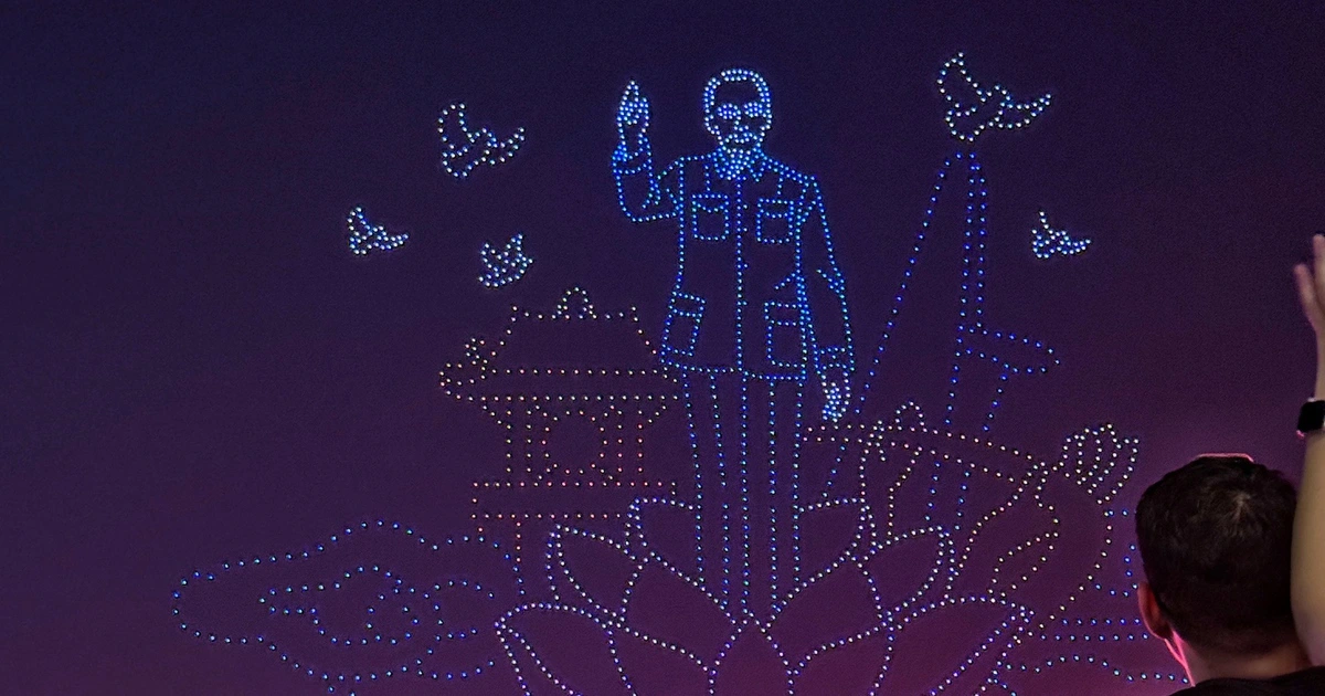 Dõi mắt xem drone trình diễn trên sông Sài Gòn, người dân và du khách tập trung ở công viên bến Bạch Đằng (Q.1) vô cùng thích thú.