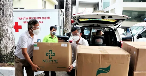 Nhà báo Đại Dương (trái) đại diện báo Tiền Phong cùng Tổng công ty Điện lực miền Nam hỗ trợ trang thiết bị y tế cho Bệnh viện Chợ Rẫy trong những ngày cao điểm chống dịch |