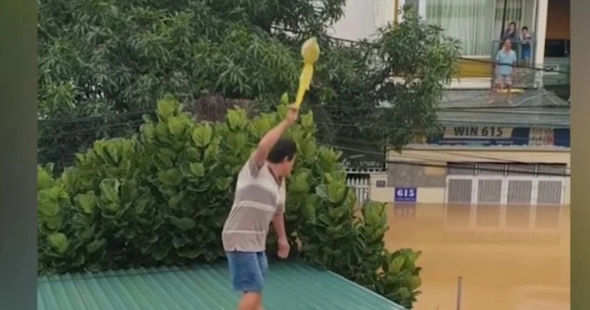 Trong video, người đàn ông trung tuổi đứng trên mái tôn khi nước lũ đã dâng hơn 2m. Sau vài giây lấy đà, ông quay túi đồ ăn ba vòng rồi ném mạnh sang nhà đối diện, nơi nhiều người già và trẻ nhỏ đang chờ đợi.