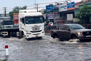 Sau trận mưa lớn chiều 24-4, quốc lộ 1 đoạn trước Bệnh viện Nhi đồng Đồng Nai (thành phố Biên Hòa) lại bị ngập cục bộ