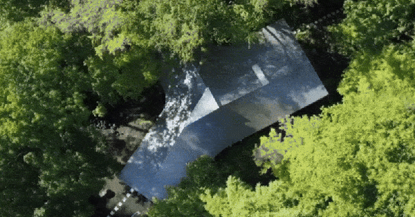 Công trình mở rộng theo ba hướng, ba khối nhà thẳng nối với nhau; phần kết nối giữa chúng là những đường cong mềm mại. Ý tưởng này vừa giảm thiểu tác động với hệ thực vật, vừa tạo ra những khoảng nhìn đa chiều, mỗi góc nhà đều là một khung cảnh rừng khác nhau.