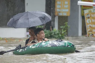 Mưa lớn do ảnh hưởng của bão số 10 khiến nước trên sông Lam dâng cao đang gây ngập tuyến quốc lộ 1A, đoạn xã Nghi Xuân (tỉnh Hà Tĩnh).