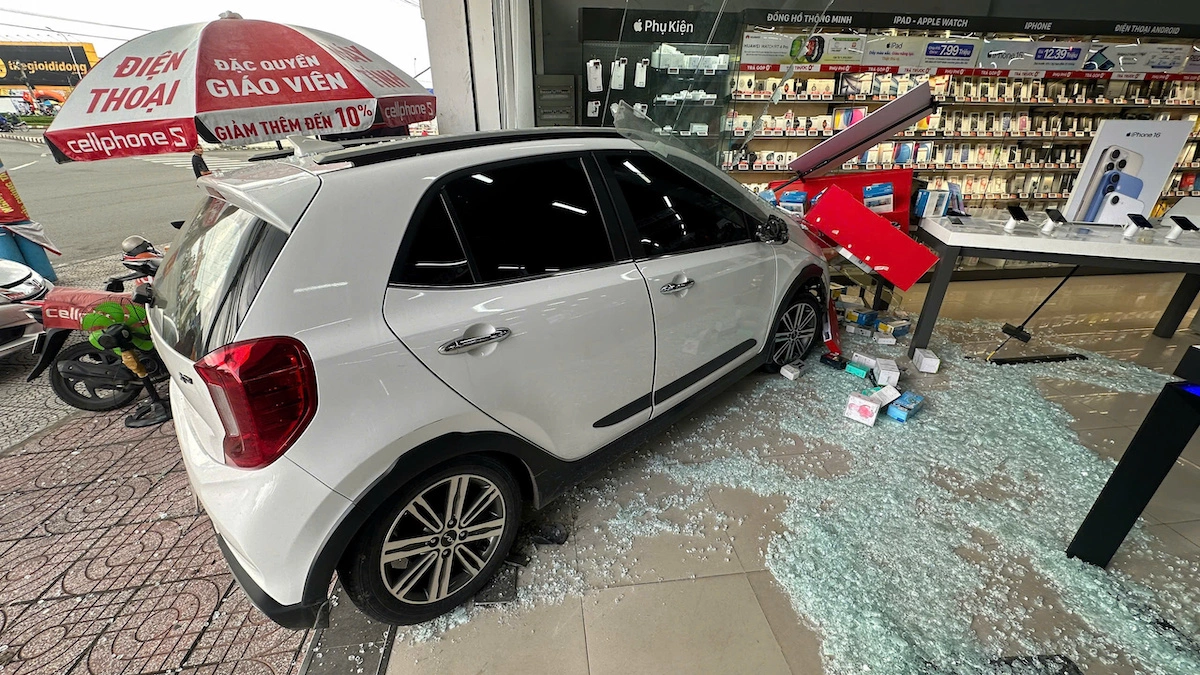 Cú va chạm mạnh khiến cửa kính vỡ tung, tủ trưng bày nứt vỡ, nhiều điện thoại, phụ kiện văng khắp nơi. "Ôtô không va chạm với ai nhưng lao thẳng vào cửa hàng. May lúc đó chưa có khách nên không ai bị thương", chị Loan, nhân chứng, nói.
