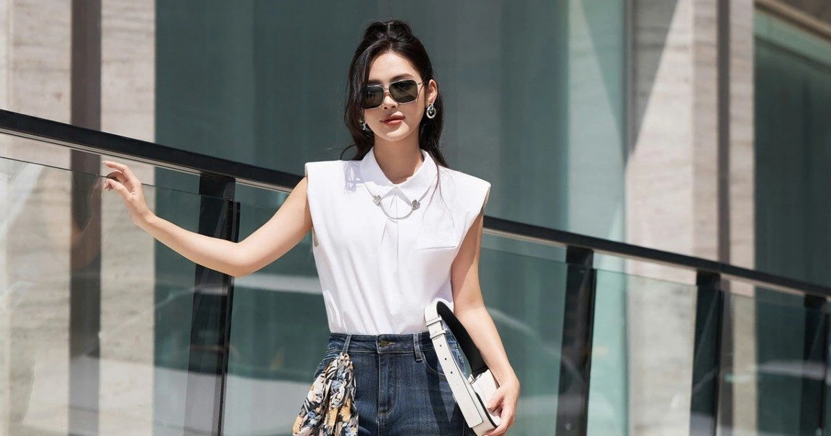 Những cô gái yêu kiểu dáng sắc nét có thể chọn áo sơ mi sát nách với phom đứng nhẹ, sơ vin gọn cùng quần denim ống loe cạp cao, giúp đôi chân trông dài và thon hơn, đồng thời tạo tỷ lệ cơ thể hoàn hảo.