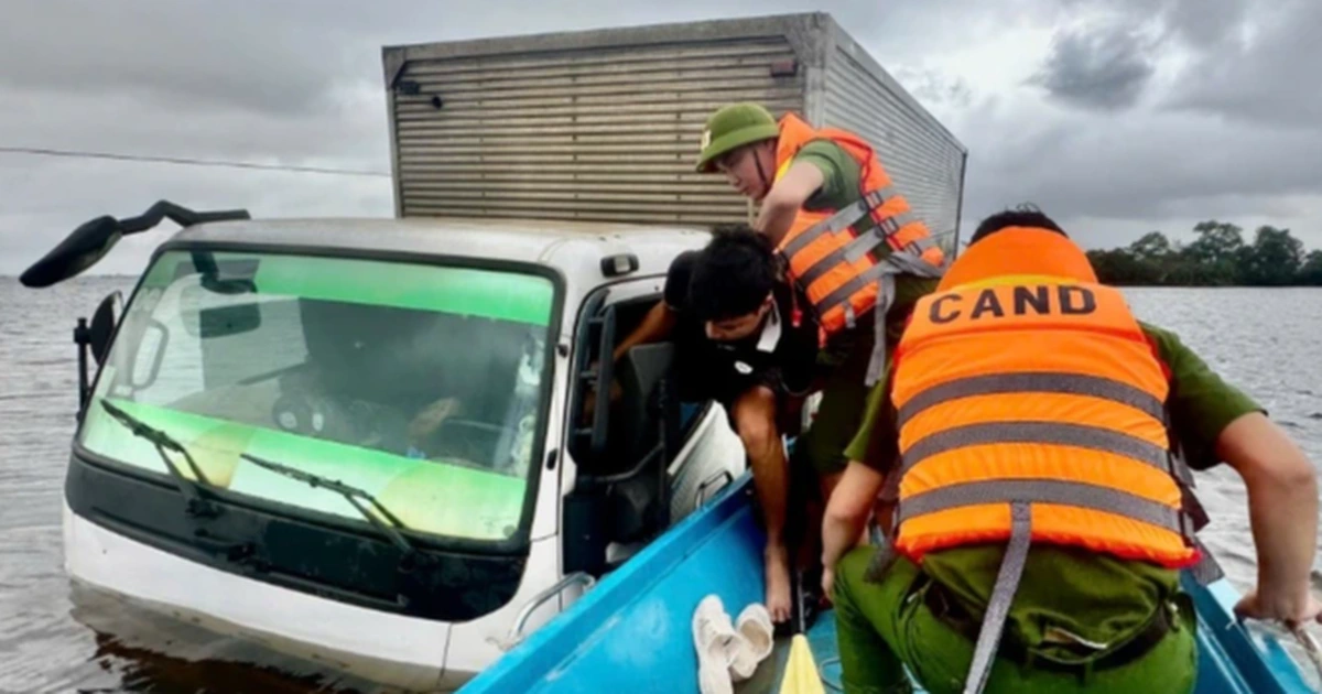 Ngay sau khi nhận được thông tin, Công an xã Mỹ Thủy đã khẩn trương có mặt tại hiện trường triển khai công tác cứu hộ, đưa 2 người trên xe tải mắc kẹt giữa nước lũ đến nơi tránh trú an toàn.