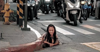 Một người phụ nữ bất ngờ “bò” lên từ miệng ống cống ngay giữa phố đông ở thành phố Makati, Philippines khiến nhiều người tưởng như đang chứng kiến cảnh phim kinh dị.