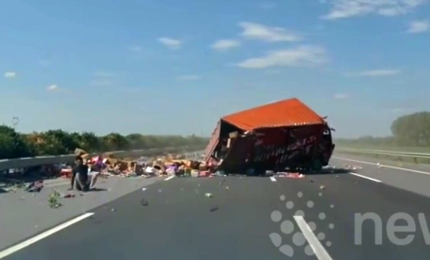 TRUNG QUỐC - Chiếc xe tải bất ngờ mất lái đâm vào lề đường, lật nghiêng trên cao tốc.