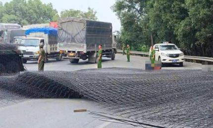 Xe container chạy trên quốc lộ 51 (phường Tân Phước, TP.HCM) rơi nhiều khối sắt xuống đường, khiến người đi xe máy ph