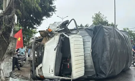 Tránh xe máy, xe tải lao vào trụ điện rồi lật nhào