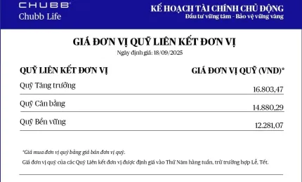 Chubb Life cập nhật giá đơn vị Quỹ Liên kết Đơn vị - Sản phẩm Kế hoạch Tài chính Chủ động