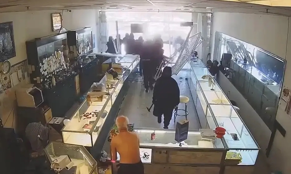 Cụ ông 88 tuổi, chủ cửa hàng, sợ hãi khi thấy nhóm cướp lao về phía ông. Trong lúc ông cố ngăn họ cướp bóc, phá hoại cửa hàng, một kẻ đã đẩy mạnh ông xuống đất. Nhân viên còn lại trong cửa hàng sợ hãi giơ hai tay đầu hàng, đứng nép vào góc tường.